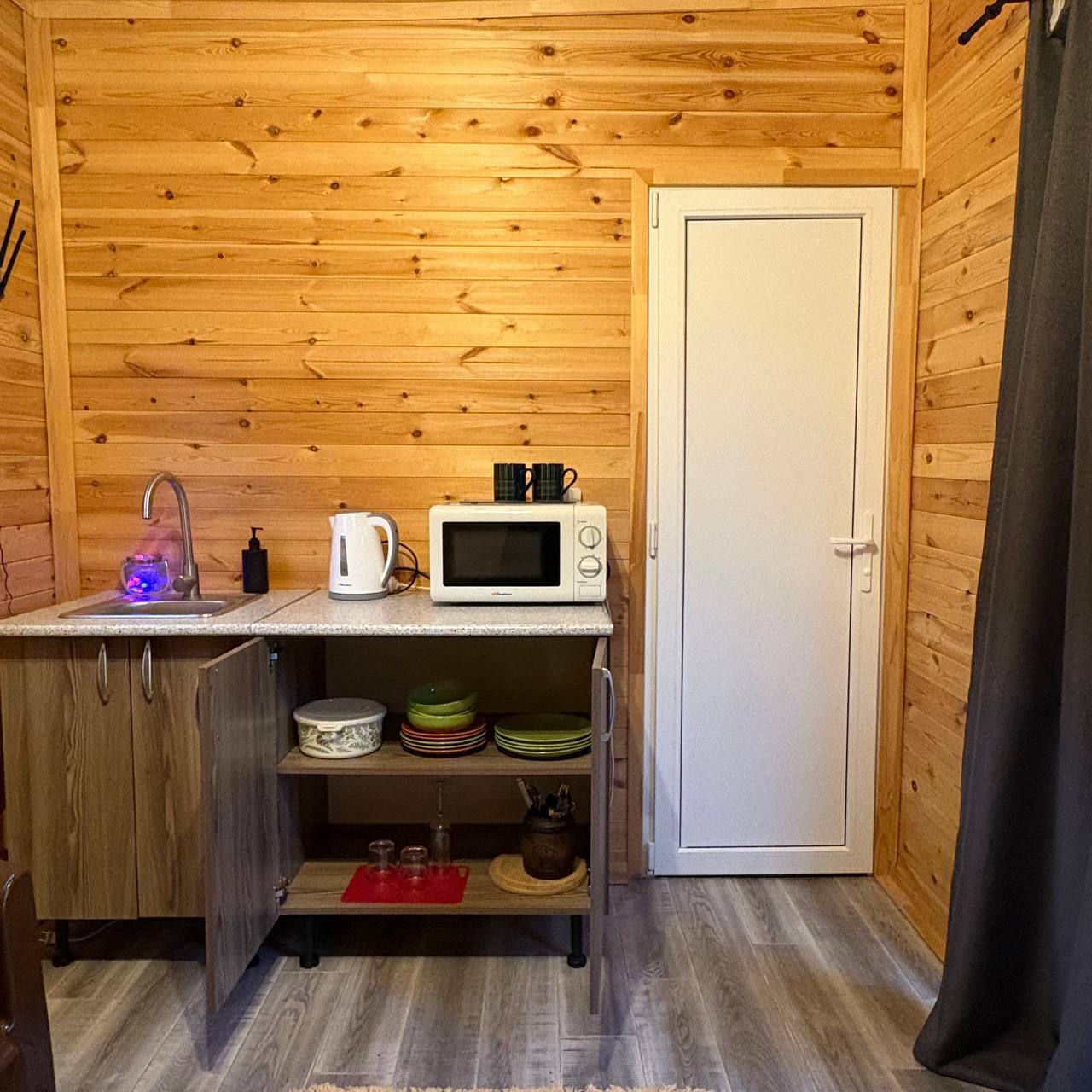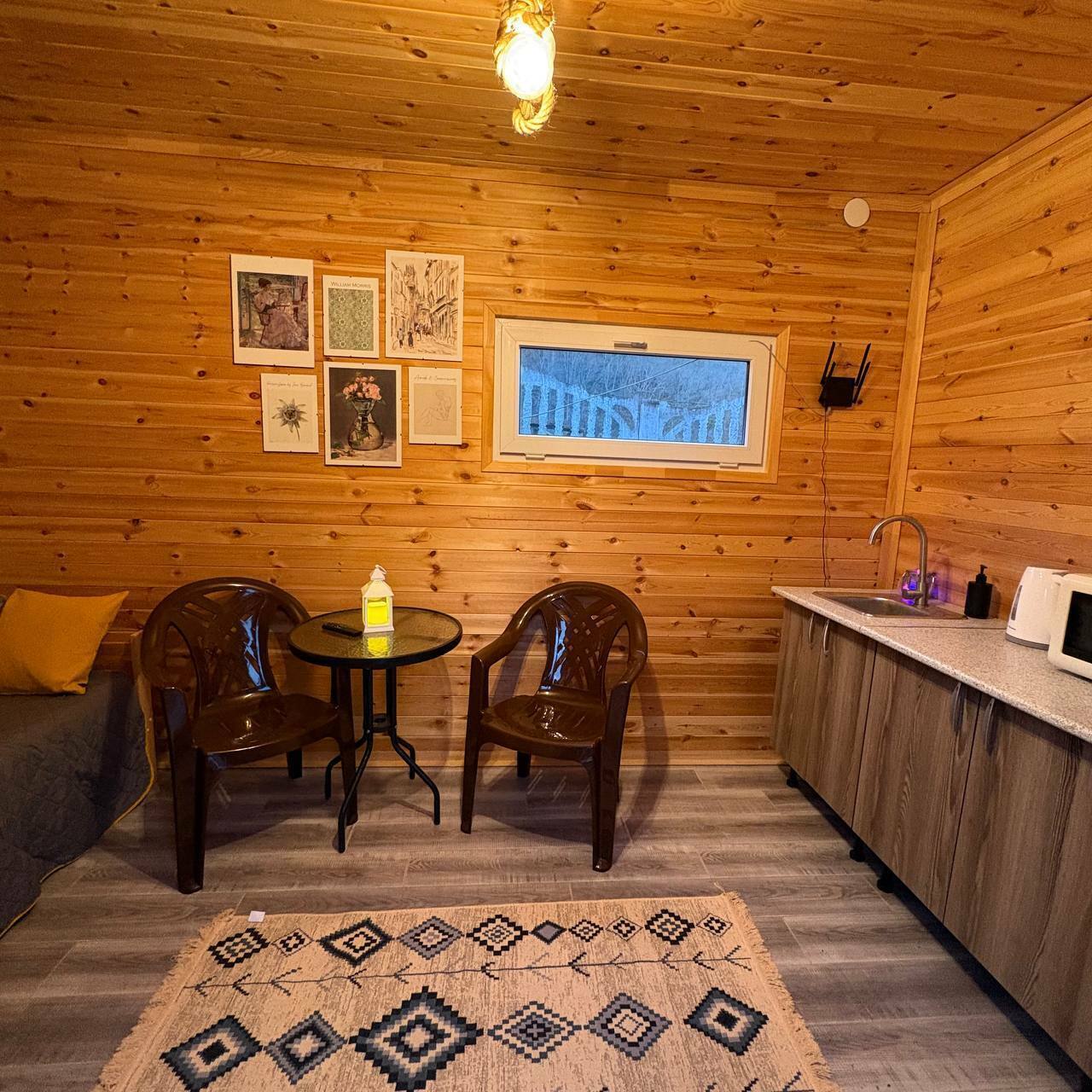 В домике двуспальная кровать и кухонная зона.