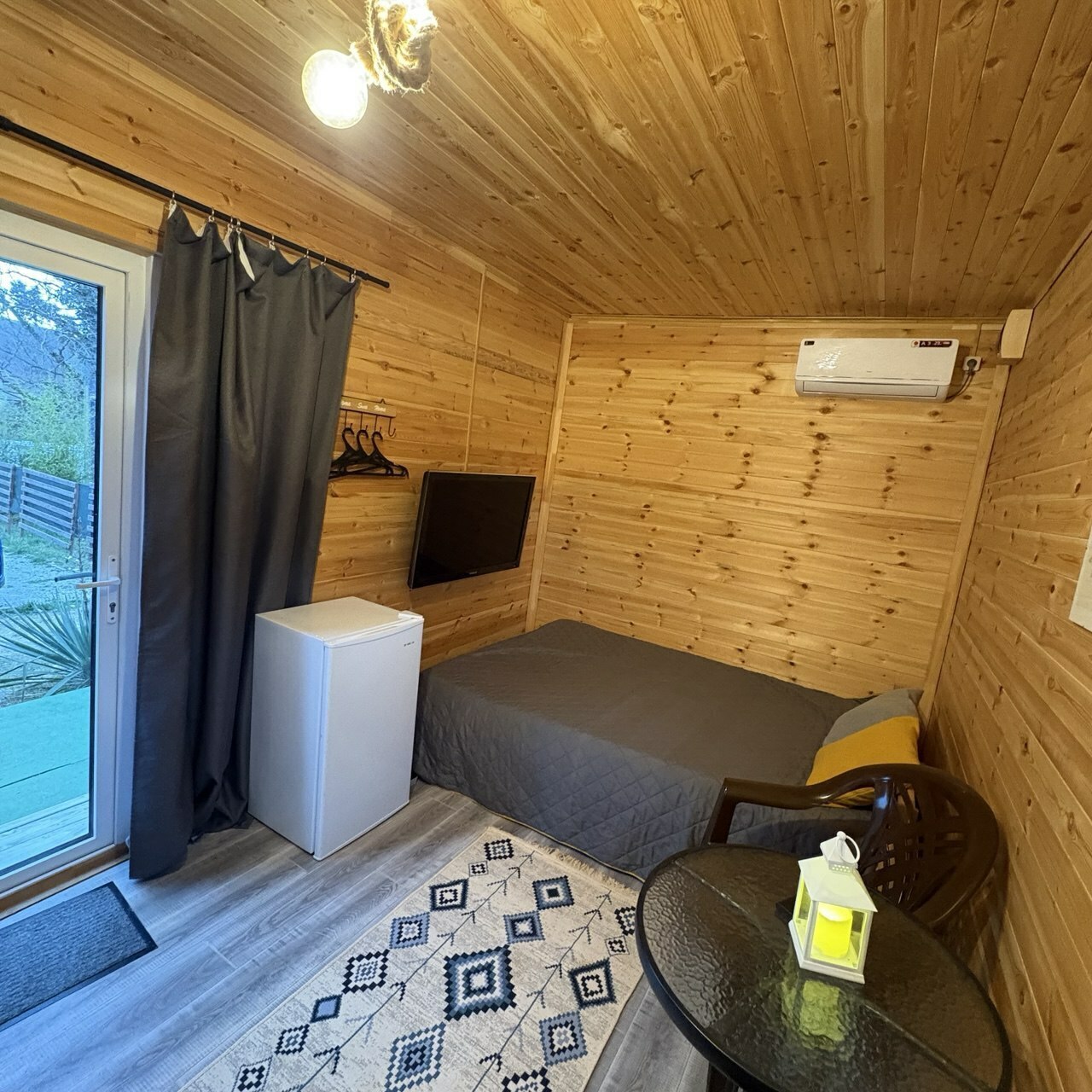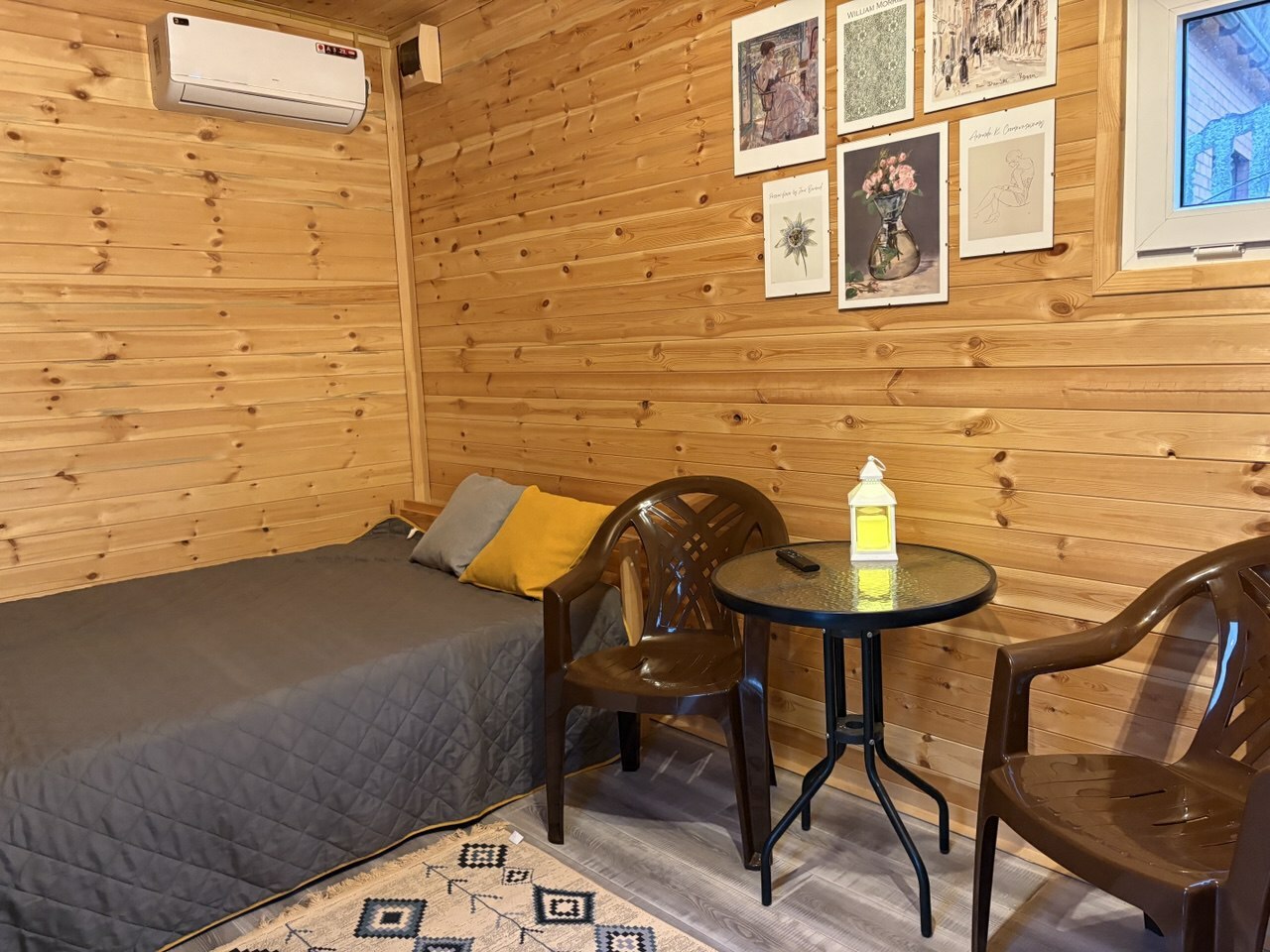 Домик с панорамным окном, террасой. В комнате двуспальная кровать и раскладной диван, комод.