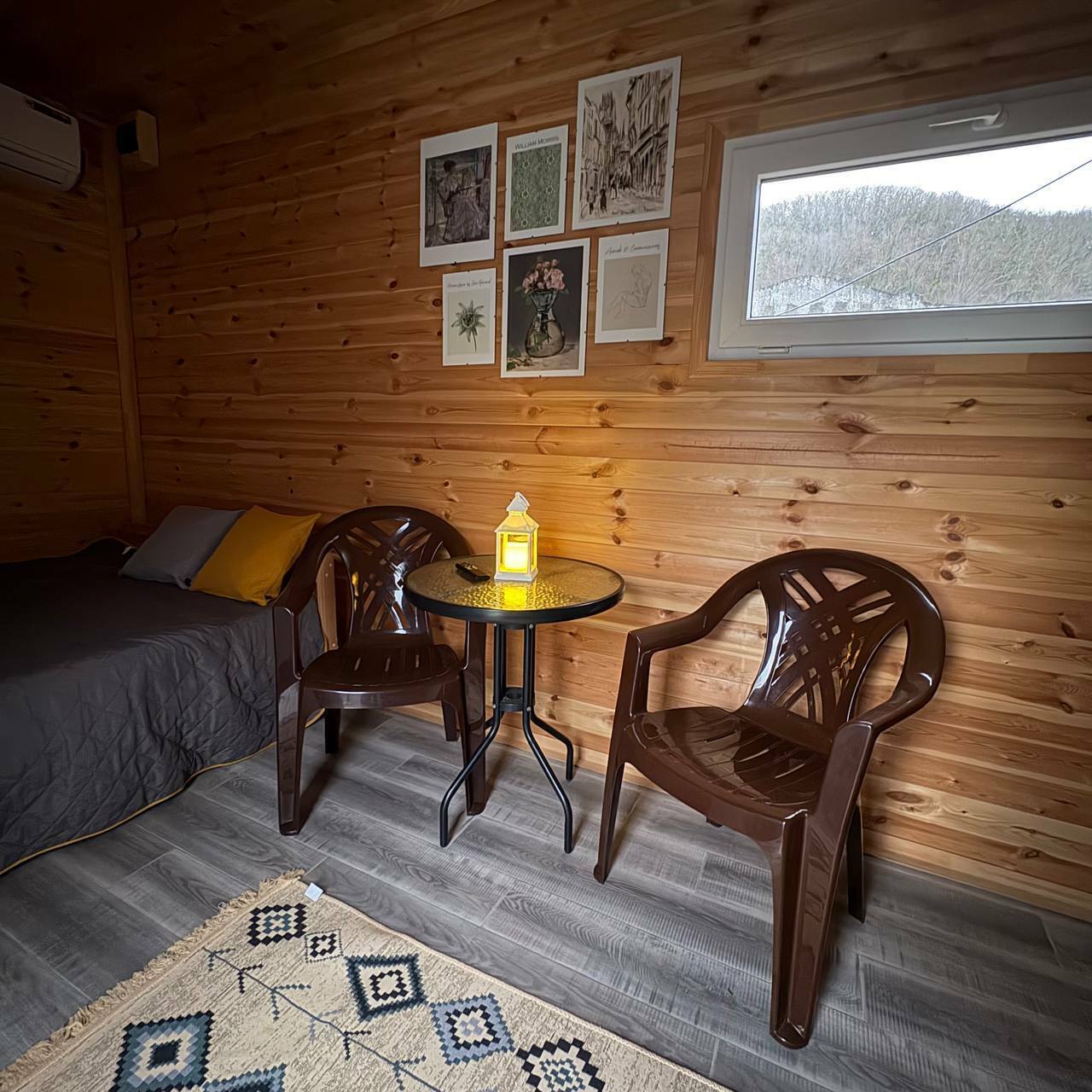 Домик с панорамным окном, террасой. В комнате двуспальная кровать и раскладной диван, комод.